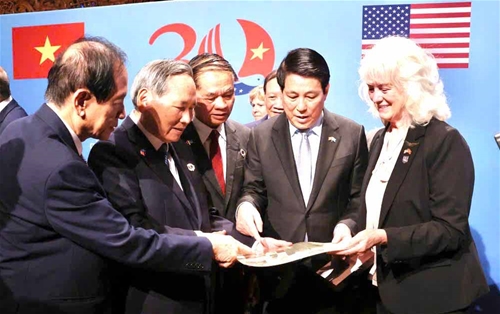 Từ trái sang: Ông Võ Hoài Nam (con trai thứ của Đại tướng Võ Nguyên Giáp), Trung tướng Phùng Khắc Đăng, nguyên Phó Chủ nhiệm Tổng cục Chính trị Quân đội NDVN, Trưởng đoàn CCB Việt Nam, Thiếu tướng Hoàn Kiền, Thiếu tướng Hoàng Anh Tuấn và Chủ tịch nước Luong Cường giới thiệu những kỷ vật của CCB Việt Nam cho đại diện CCB Hoa Kỷ.