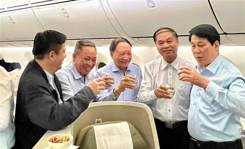 Thiếu tường Hoàng Anh Tuấn và Thiếu tướng Hoàng Kiên cùng 2 thành viên đoàn công tác CCB Việt Nam có phút thư giãn trên máy bay cùng Chủ tịch nước Lương Cường.
