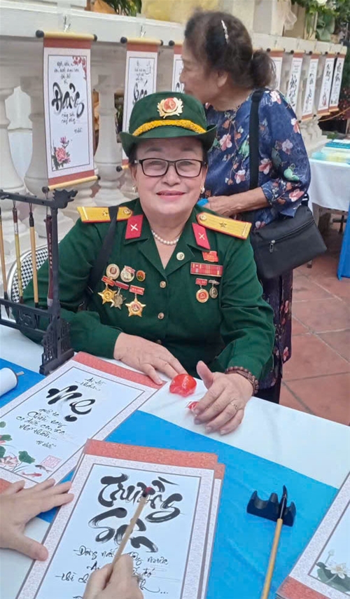Đồng chí Ngô Thị Tuyết tham gia chương trình viết thư pháp.