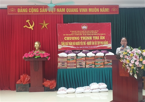 Đồng chí Phan Thị Tùy- Phó giám đốc Trung tâm Thơ caViệt Nam, cùng đại diện Chi Bộ, MTTQVN, các nhà tài trợ và đội thiện nguyện tổ chức trao 40 phần quà ( gồm: Gạo, mỳ tôm, nước mắm, bánh kẹo… cho 40 cư dân-Diện người yếu thế, người tàn tật và trẻ em TDP Phụ Khang, phường Sơn Tây, thành phố Hà Nội.