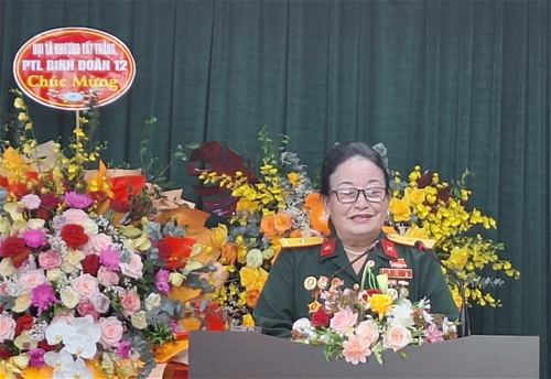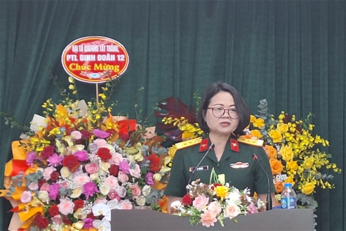 Đồng chí Ngô Thị Tuyết- Trưởng ban công tác nữ Hội TSVN, phát biểu và trao tặng hoa quà chúc mừng BLL Nữ trung đoàn 17.