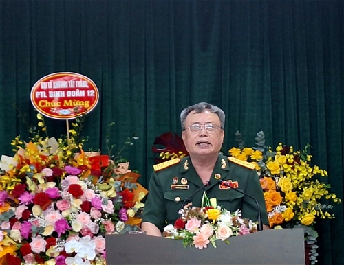 Đại tá Đoàn Danh Bình - UVBTV, Chánh Văn phòng Hội TSVN, nguyên Chính uỷ trung đoàn 17, Phó chủ tịch Thường trực Hội Trường Sơn trung đoàn 17, phát biểu và trao tặng hoa quà chúc mừng buổi lễ.