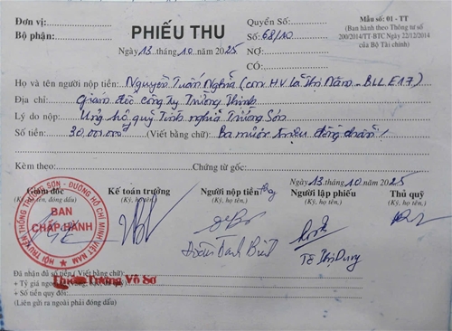 Phiếu thu anh Nguyễn Tuấn Nghĩa trao tặng 30 triều đồng ủng hộ Quỹ Nghĩa tình Trường Sơn.
