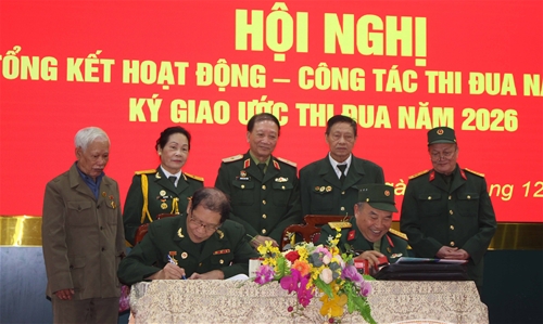 Các đồng chí Chủ tịch Hội TS 5 tỉnh trong Cụm Thi đua ký kết giao ước thi đua năm 2026 trước sự chứng kiến của Phó Chủ tịch Thường trực Hoàng Anh Tuấn.
