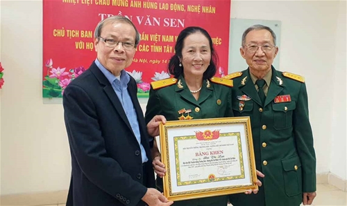 Chủ tịch Nguyễn Thế Tuấn và Ủy viên Thường vụ Nguyễn Thị Kim Quy trao Bằng khen cho đồng chí Nguyễn Đức Hoài (PCT Hội TS 471 Miền Trung Tây Nguyên).
