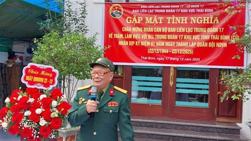 Ngày 17/12/2025, nhân dịp kỷ niệm 81 năm Ngày thành lập QĐND Việt Nam (22/12/1944 - 22/12/2025) và thực hiện kế hoạch hoạt động của Ban liên lạc Trung đoàn 17 - Lữ đoàn 17 (BLL E17 - LĐ17). Được đồng chí Trưởng ban ủy quyền, Đoàn công tác do Đại tá Đoàn Danh Bình - Phó Ban liên lạc Thường trực, Đại tá Phùng Quang Vy - Phó ban, Đại tá Nguyễn Duy Trường - Phó ban cùng đại diên Thường trực và Uỷ viên BLL E17 - LĐ17 về làm việc với BLL E17 khu vực Thái Bình (cũ) tỉnh Hưng Yên; Tặng quà Hội viên khó khăn, thắp hương tri ân các cán bộ lão thành và thăm gia đình Hội viên tiêu biểu.