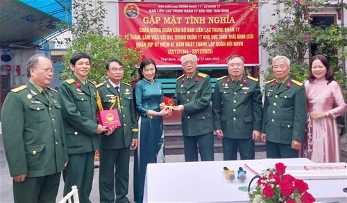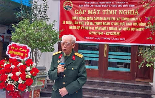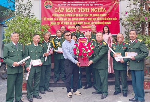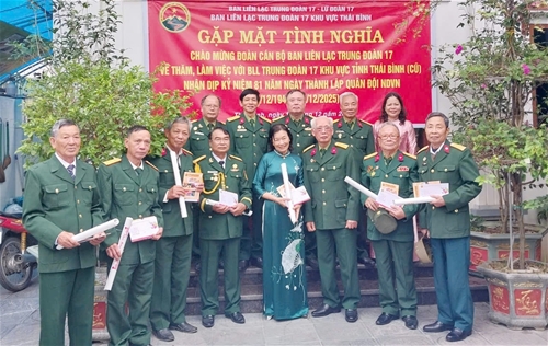 Nhân dịp này, kỷ niệm 81 năm Ngày thành lập QĐND Việt Nam 22/12 (1944 - 2025), Đoàn công tác thông qua BLL E17 Thái Bình tặng quà Hội viên Trịnh Xuân Chướng ở Vũ Thư, Thái Bình ốm đau nặng, Đoàn về huyện Đông Hưng (cũ) thăm, tặng quà tri ân gia đình, thắp hương đồng chí Vũ Xuân Hồi, nguyên Chủ nhiệm Chính trị Trung đoàn 17; Thăm gia đình hai đồng chí nguyên cán bộ thuộc Trung đoàn 17 trên 80 tuổi là đồng chí Nguyễn Hữu Bằng, Hoàng Phó Ướng ở Đông Hải, Quỳnh Phụ (cũ); Thăm thân nhân, quê hương gia đình đồng chí Đoàn Danh Bình ở xã Tiên Lữ; Thăm gia đình, tặng quà tri ân và thắp hương cụ Đỗ Đoan, nguyên Chủ nhiệm Chính trị Trung đoàn 17 ở Khoái Châu, tỉnh Hưng Yên.