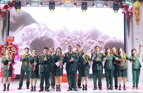 Lãnh đạo tặng hoa đội văn nghệ Trường Sơn tỉnh Nghệ An biểu diễn chúc mừng hội nghị.