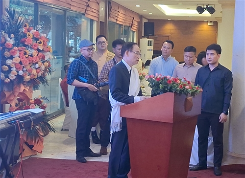 Đồng chí cán bộ đại diện Đại sứ quàn Nước CHDCND Lào đón nhận lẵng hoa tươi thắm của Hội TSVN kính tặng.