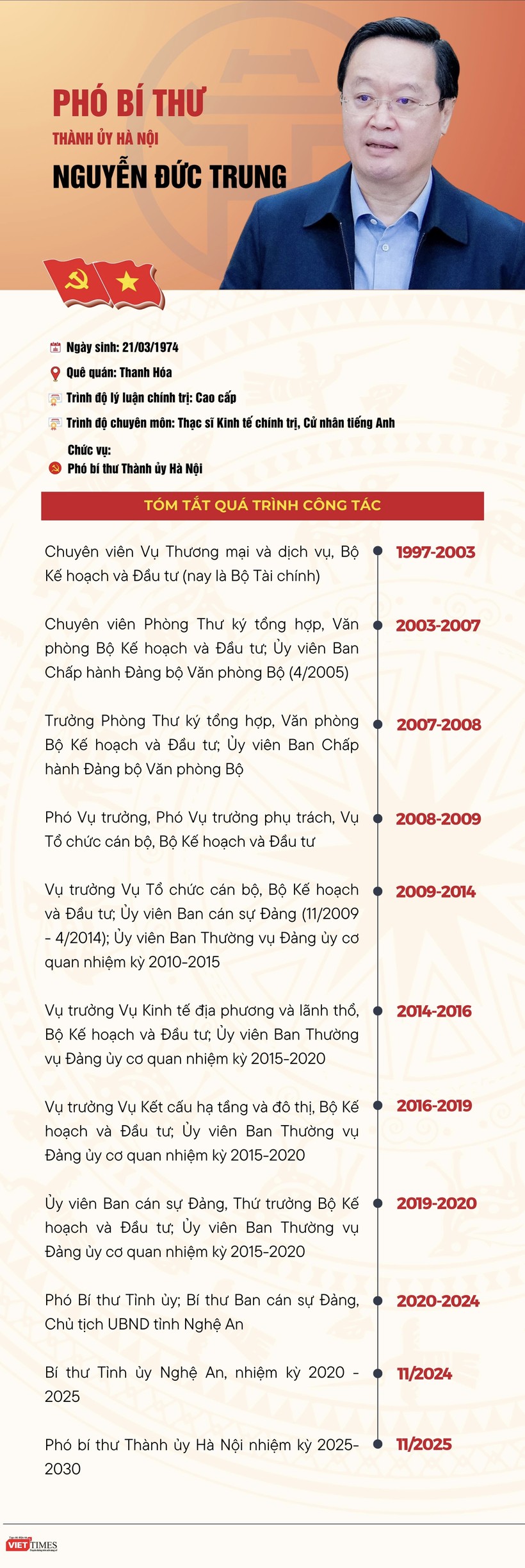 Bộ Chính trị đồng thời điều động, chỉ định ông Nguyễn Đức Trung tham gia Ban Chấp hành Đảng bộ, Ban Thường vụ Thành ủy Hà Nội, giữ chức Phó bí thư Thành ủy Hà Nội, nhiệm kỳ 2025-2030.